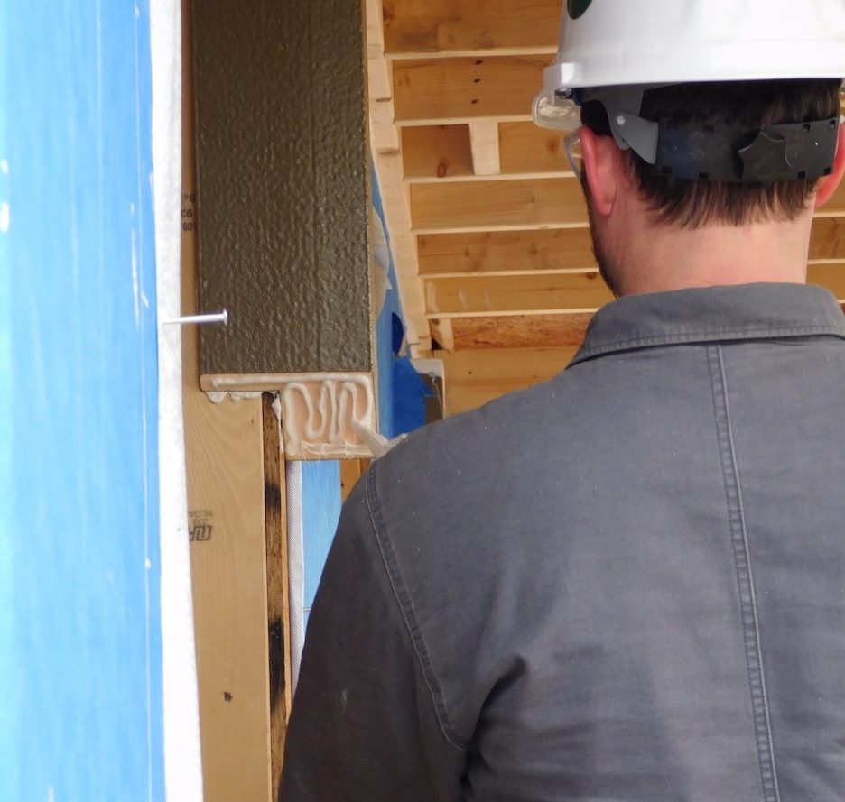 You’ll use three 3/8″ beads on every piece of ThermalBuck, on the mitered ends, and around the perimeter where it meets the sheathing. Also, on the nail flange of the window. In the interior, sealant is needed at the transition of ThermalBuck to the window, and where it meets the framing.
